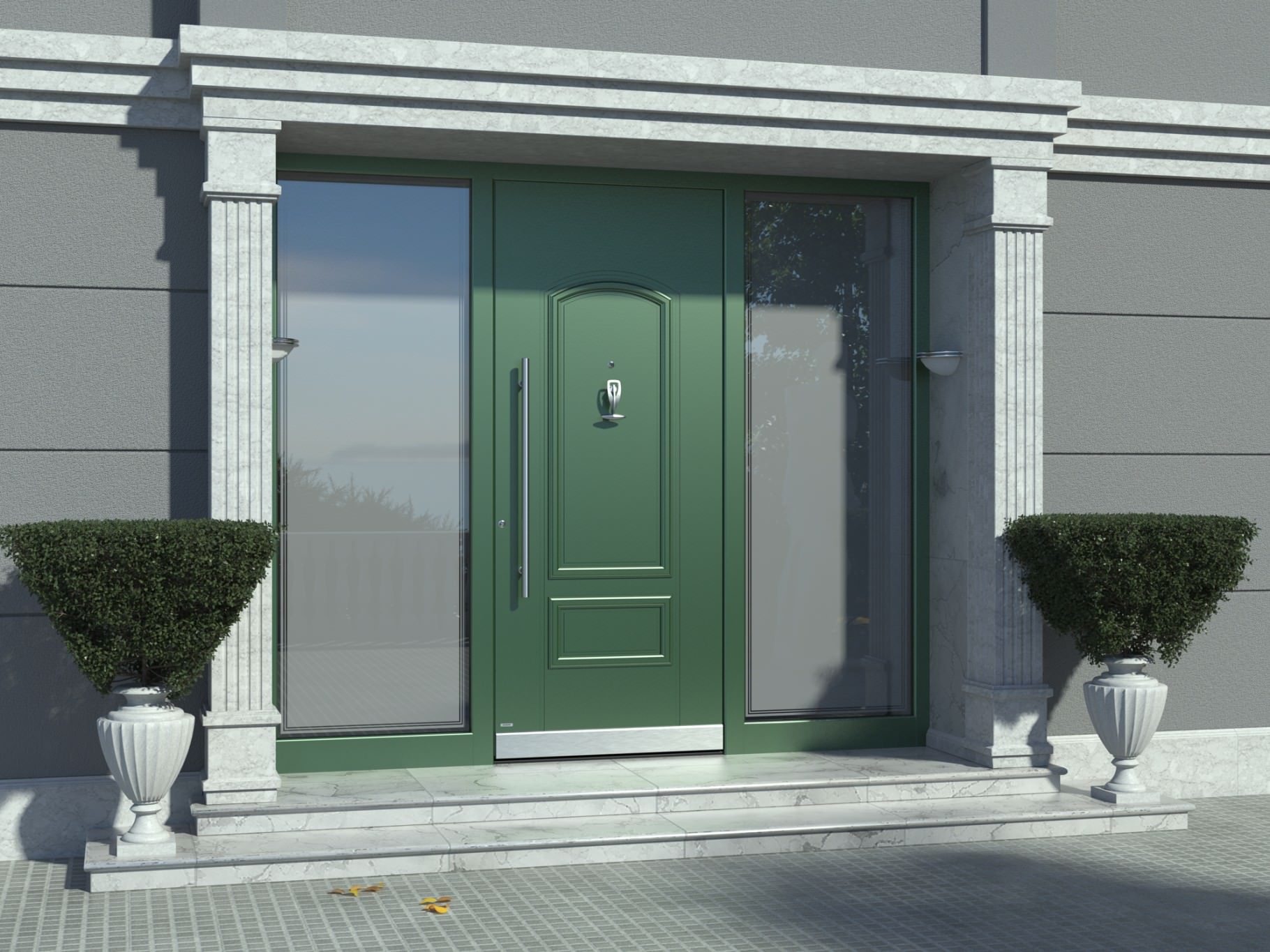 Твърдост, здравина, безопасност - впечатлението, което създава този чудесен пример на класическа входна врата. Моделът 3200 е перфектно завършен от стилно чукало и номера на къщата, подравнен с плоскостта на вратата.